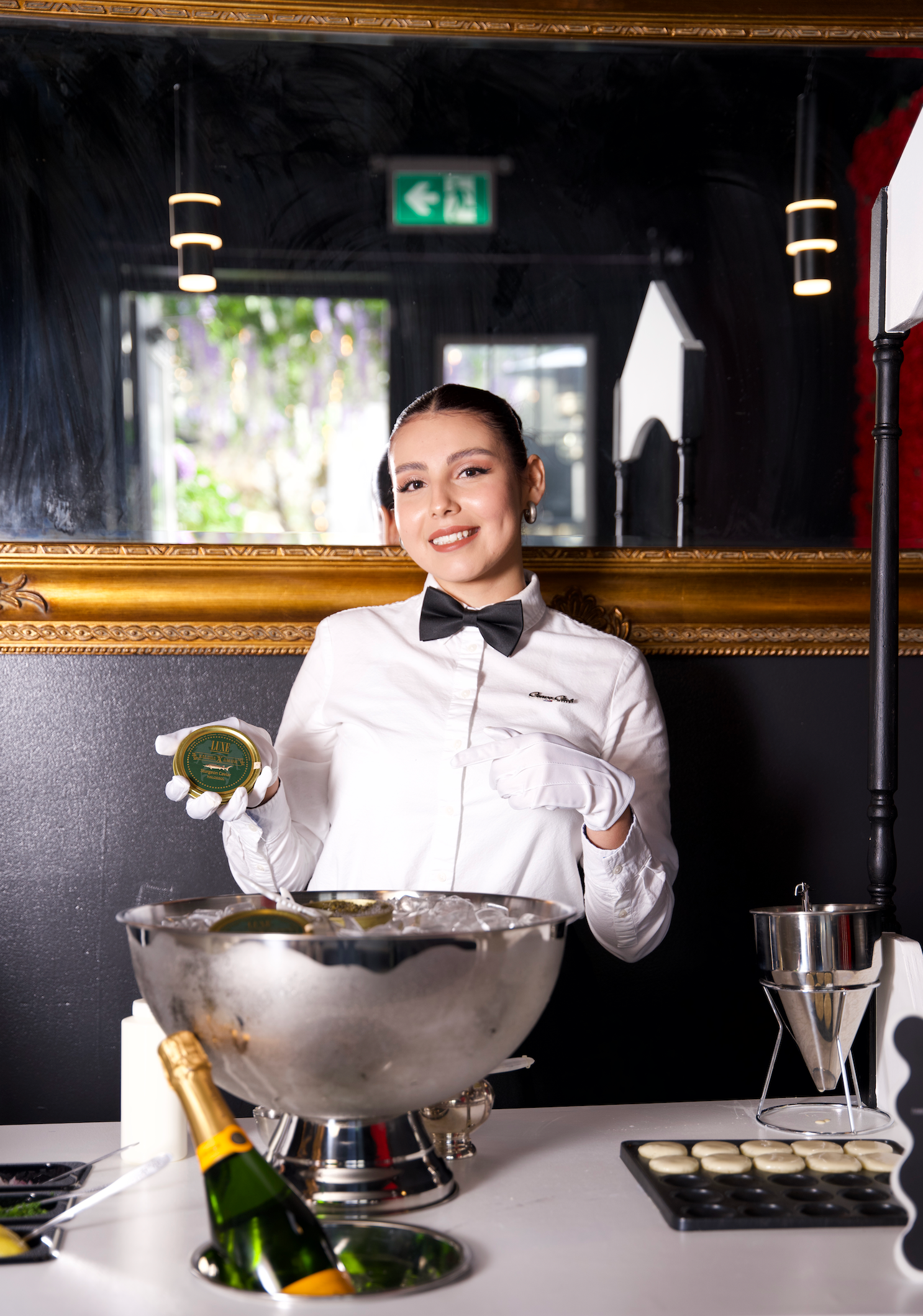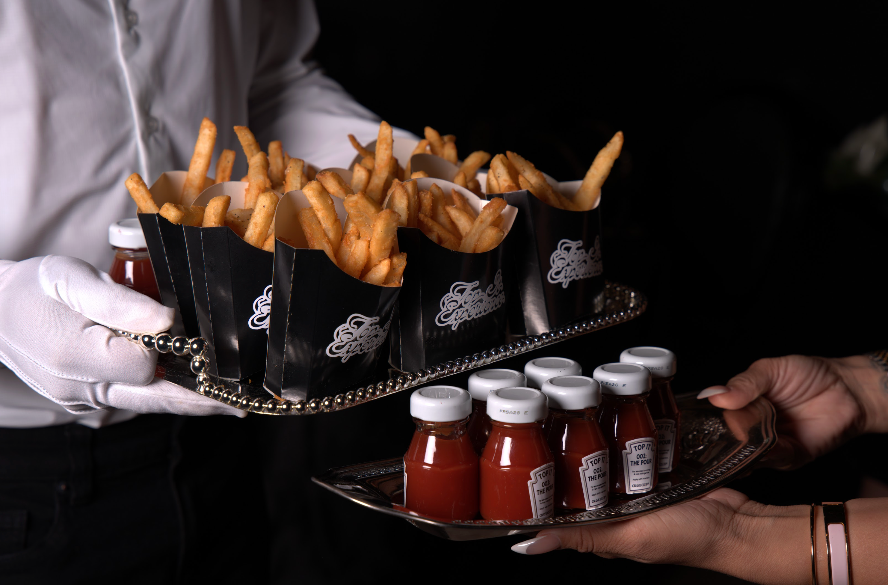 (For events with 100+ guests) Can’t bring everyone to the cart? We’ll bring the cart to everyone. Servers wander the room with custom-branded shoulder tables, delivering caviar-topped pancakes directly to guests. Designed for larger celebrations, weddings, cocktail hours, and corporate galas.